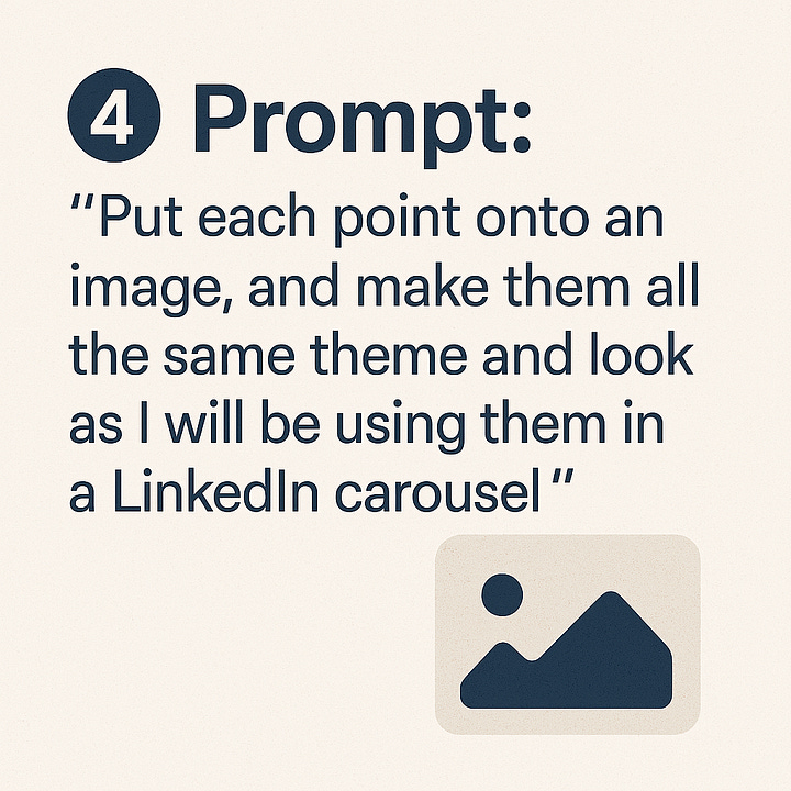 Step 4: Use the following prompt: āPut each point onto an image, and make them all the same theme and look as I will be using them in a LinkedIn carouselā.